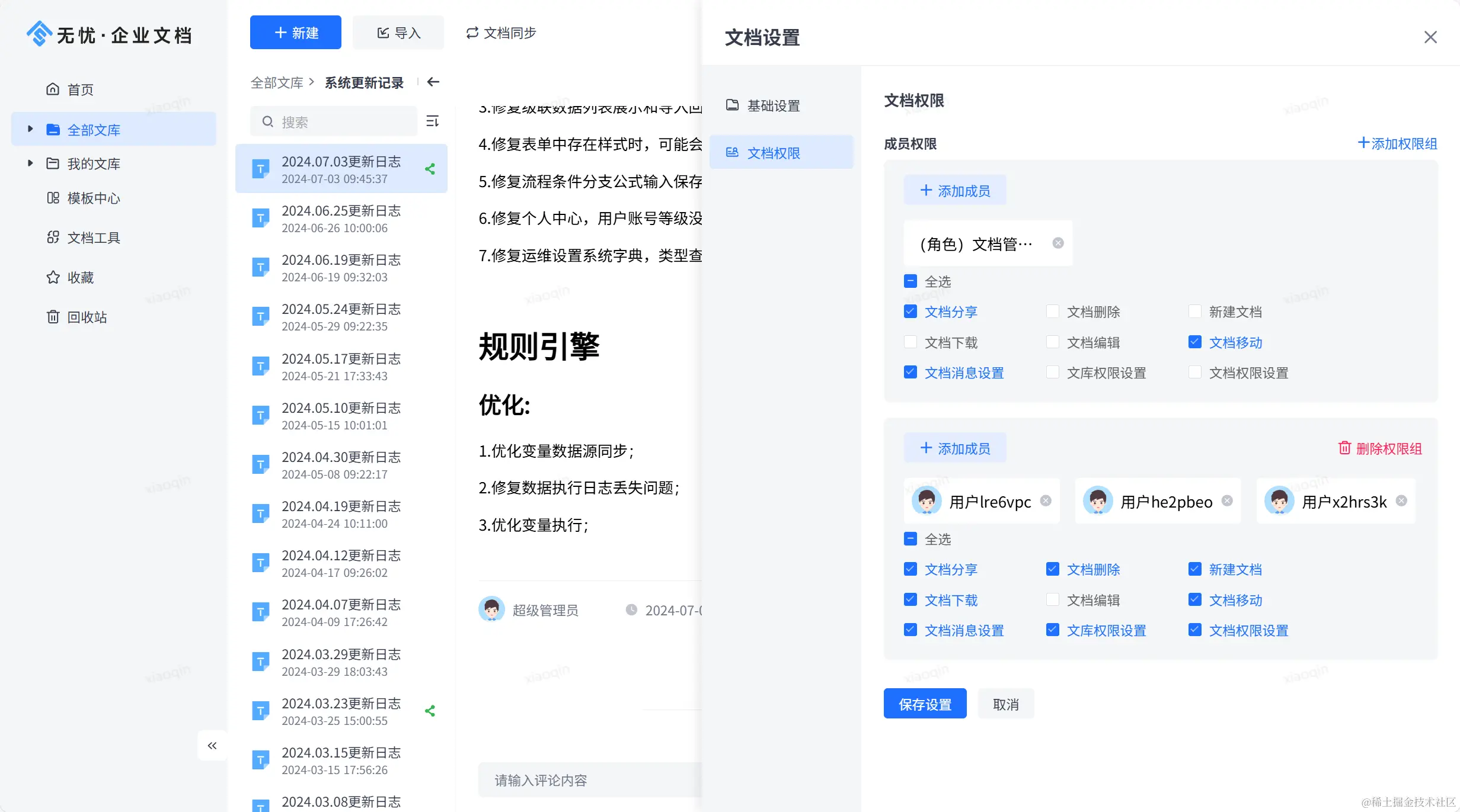 支持对内容、对文件级、文件夹级的权限管理,每个文库可独立针对不同人群配置不同的操作权限,可添加多个权限组。