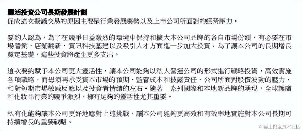 此外,在化妆品及护肤市场激烈竞争中,公司战略转型可能导致的业绩波动性也不得不考虑。欧舒丹公告中提到,要约人认为,为了在竞争日益激烈的环境中保持和扩大本公司品牌的各自市场份额,有必要在市场营销、店铺翻新、信息科技基建以及吸引人才方面进一步加大投资。为了让本公司的长期增长奠定基础,这些投资将产生更多支出。