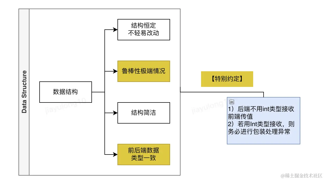 1.数据结构恒定性:前后端约定好的字段和类型不应轻易改动,若有改动需及时提前告知对方。