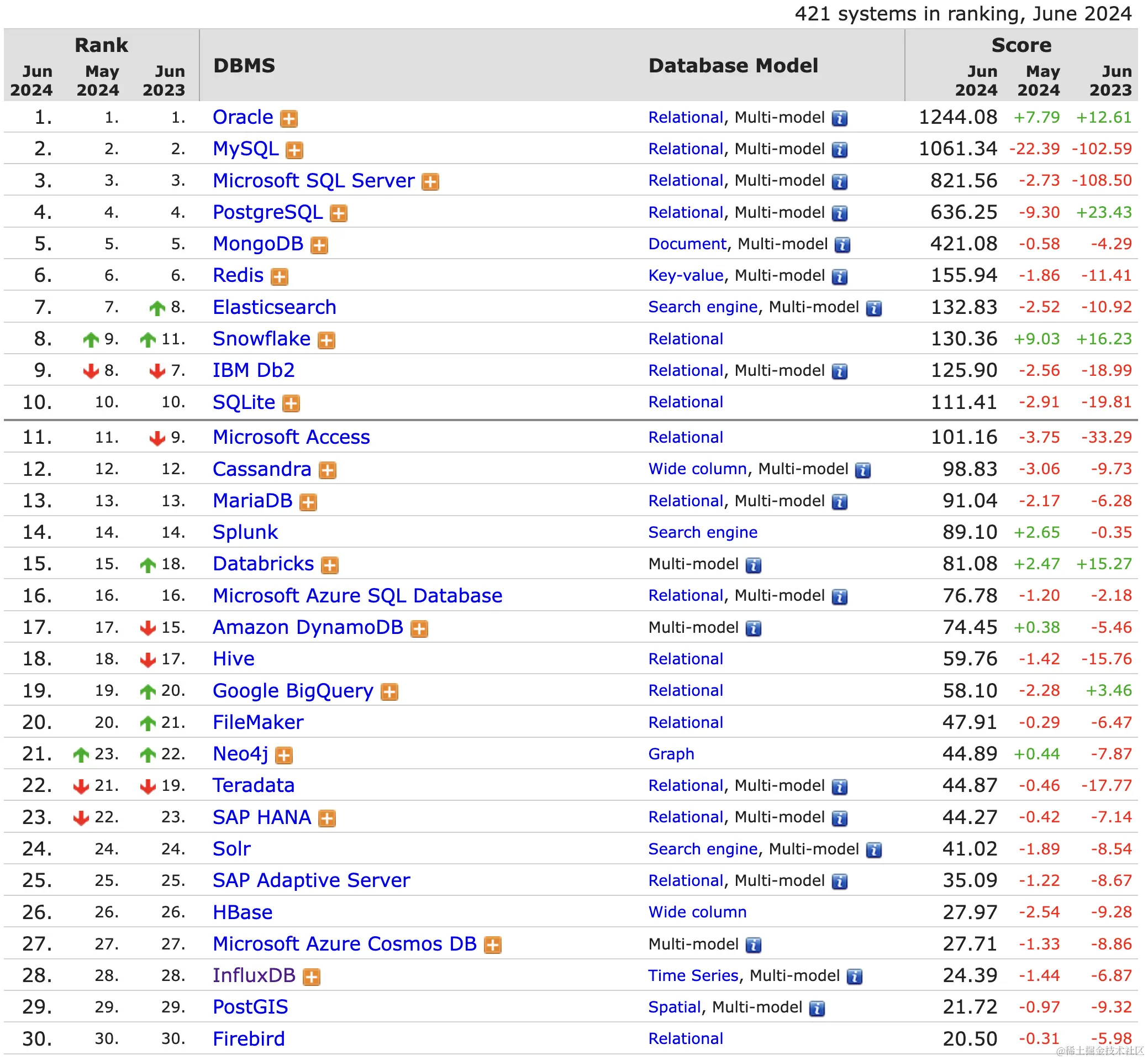 以下是2024年6月份的DB-Engines数据库排名列表,这是一个专门收集和呈现数据库管理系统信息的数据库引擎排名,里面列举了超过 300 多种数据库产品,大部分的开源和商业数据库都在列,排名中的位置通常能反映出它的使用情况。