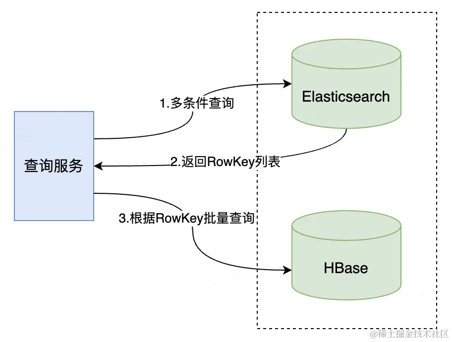 虽然HBase之上有很多开源组件,可以搞二级索引、phoenix可以支持SQL,但是当业务越来越复杂,数据量越来越大的时候,使用HBase构建复杂的查询就很吃力了,甚至很多指标无法完成,毕竟HBase本身就不是为复杂查询而生的,太折腾它也不好,所以这种情况下ES就起了关键性因素,使用HBase存储海量数据,使用ES解决复杂查询,发挥各自中间件的最大优势。面对海量数据的低成本存储+高效检索的需求,业界通常使用HBase + ElasticSearch的组合方案。