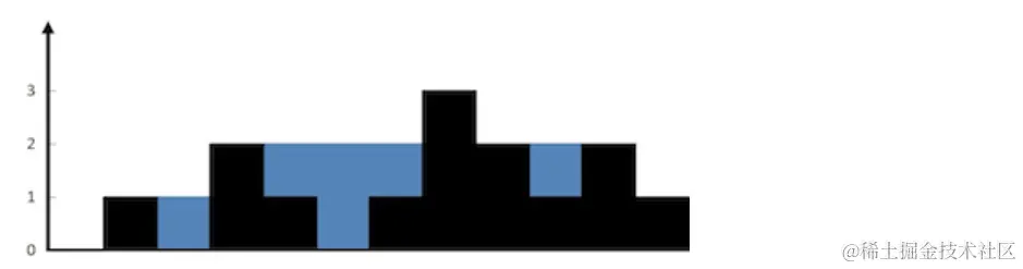 解释:上面是由数组 [0,1,0,2,1,0,1,3,2,1,2,1] 表示的高度图,在这种情况下,可以接 6 个单位的雨水(蓝色部分表示雨水)。