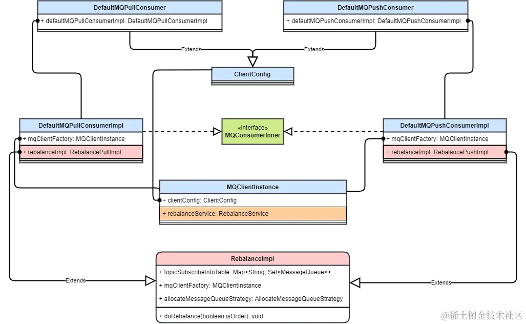 RebalanceImpl中保存了消费者负载的消息队列、重分配策略,并实现了重分配的方法(调用重平衡策略)。- 每个消费者持有一个重平衡实现,根据推和拉模式的不同,分别在