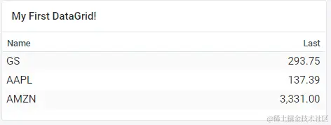 datagrid = DataGrid('My First DataGrid!', rows=rows, columns=columns)