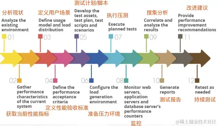 性能测试流程是指在进行性能测试时所遵循的一系列步骤和阶段,以确保对系统的全面测试和评估。性能测试流程的具体步骤可能会因组织、项目和测试需求而有所不同。