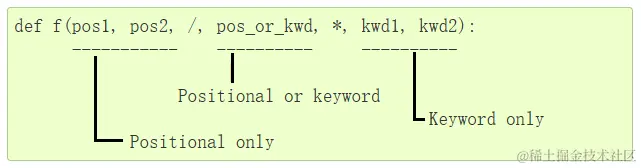 从上面可知,强制a是positional_only参数,b(不做限制)是positional or keyword参数,强制c属于keyword-only参数。