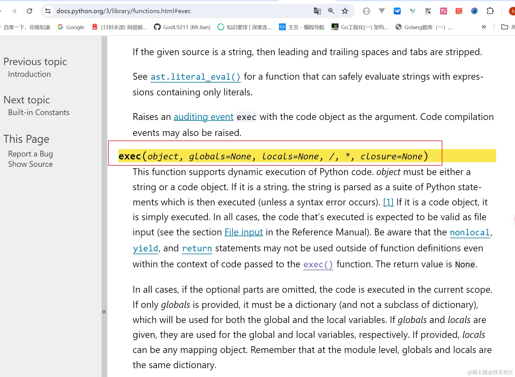 关于函数签名, exec需要注意的一件有趣的事情是globals和locals具有默认值。因此,传递这些选项不是强制性的。但是,如果您确实为这些参数传入了值,那么它必须是位置的。显然,python 核心开发人员认为这两个参数是exec函数的核心部分。