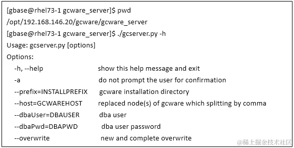 ./gcserver.py --host=IP --dbaUser=gbase --dbaPwd=gbase --overwrite