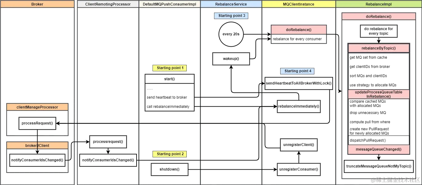 RocketMQ 的重平衡流程在消费者端完成,但是由 Broker 端发送信号给所有消费者触发。