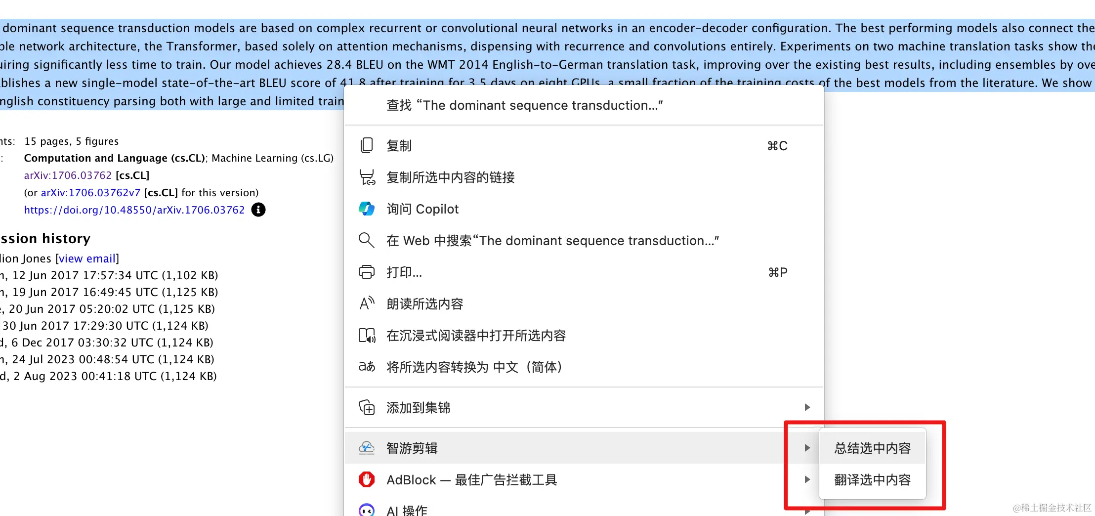 如果只想翻译某几段话,也可以直接选中文字,然后右键点一下,可以选择总结或者翻译你选中的这段话