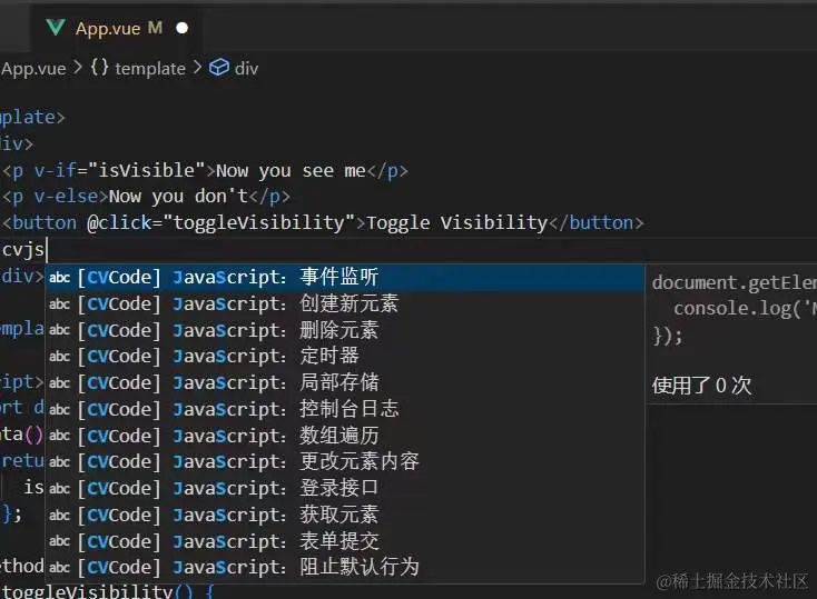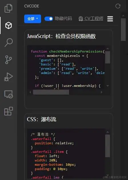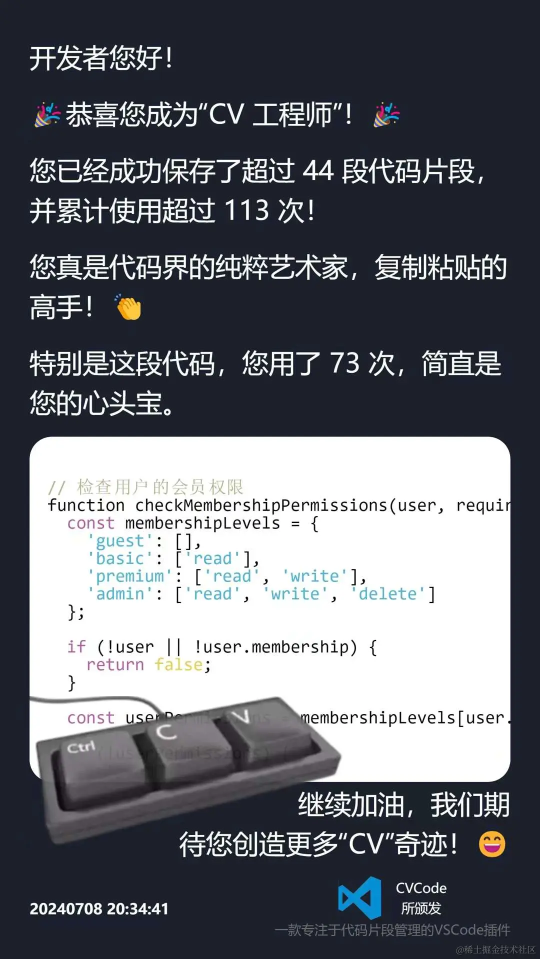 CV也很累,所以我开发了CVCode 钟阿能 2024-07-09 190 阅读1分钟 需求写多了你会发现,CV代码也是一件麻烦事! 第一,ai无法生成的业务代码,你要翻看项目才能复制过来;第二,从文档中复制常用代码也很费时。 因此,我写了一款管理代码片段的VSCode插件——CVCode。它有两大核心功能:一键保存代码和快速插入代码。 除了这些,插件还支持数据导入导出、分类管理、代码使用统计、设置代码片段标题… 另外还有一个好玩的,你还能在插件中领取“CV工程师证书”。 赶快来CVCode吧!
