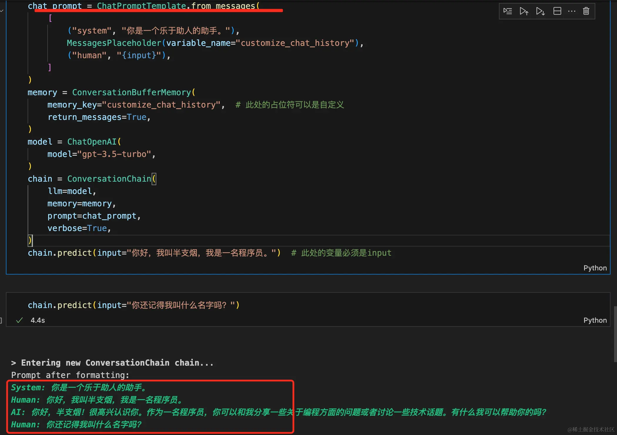 如果连ChatPromptTemplate都懒得写了,那直接使用对话链ConversationChain,让一切变得更简单。实践代码如下:
