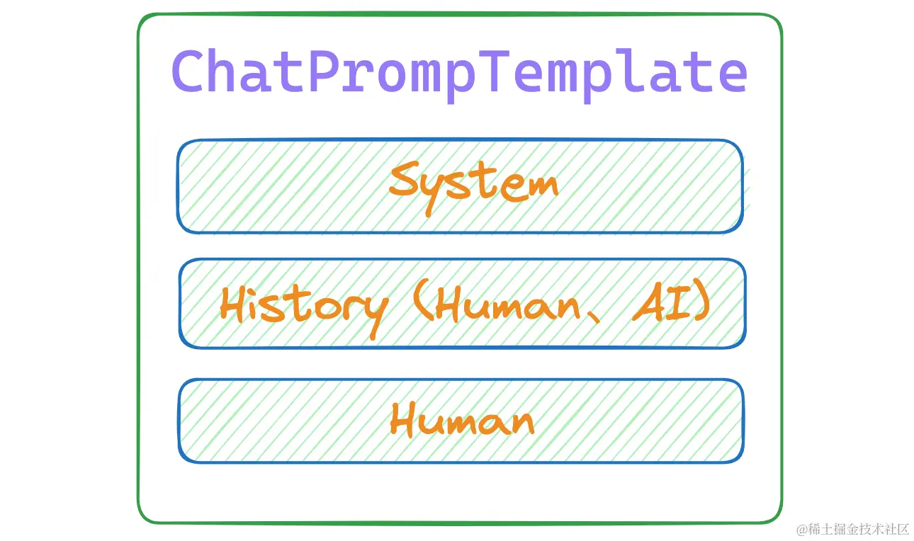 ChatPromptTemplate主要用于聊天场景。ChatPromptTemplate有多角色,第一个是System角色,后续的是Human与AI角色。因为需要有记忆,所以之前的历史消息要放在最新问题的上方。