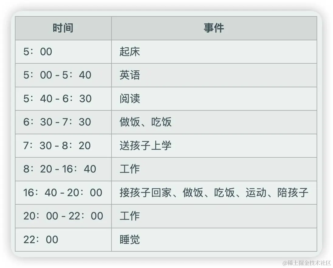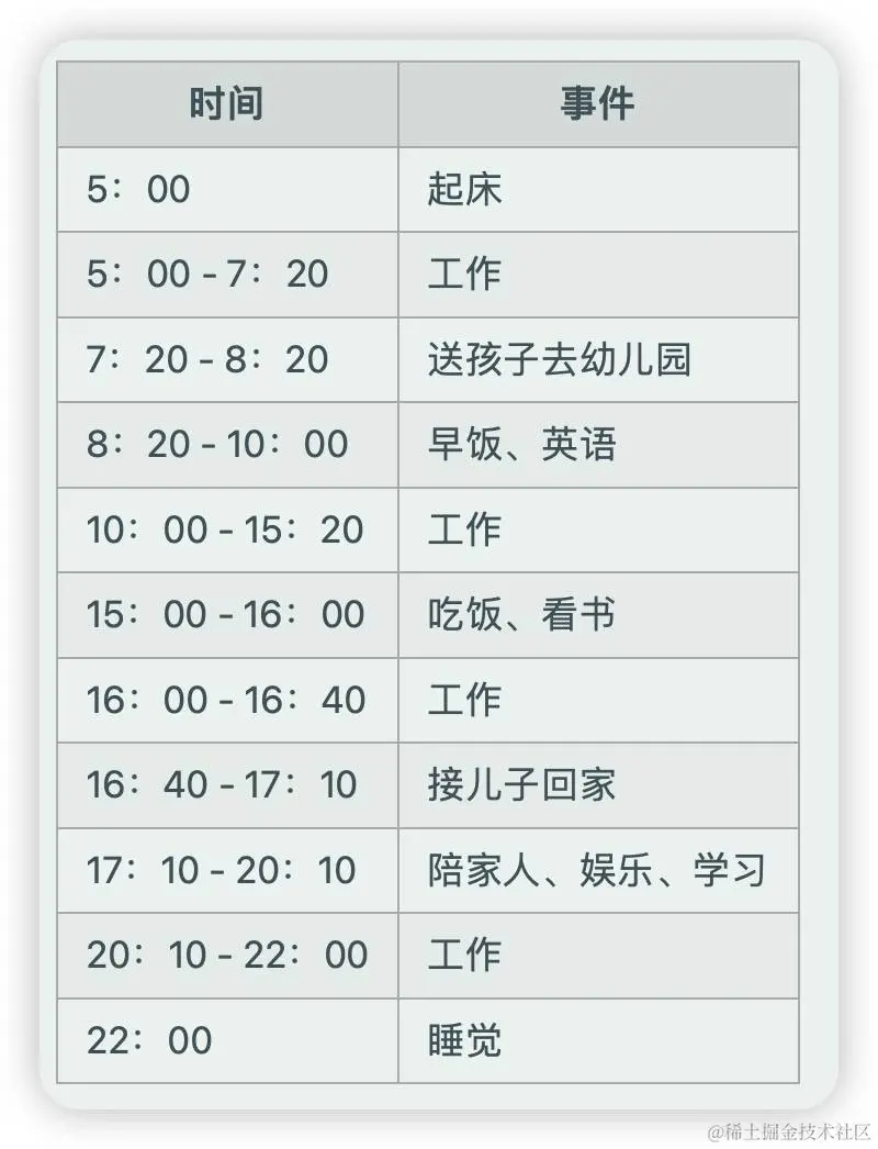 把英语学习时间提前到起床后,并且在早上做好一天的饭,一般炒两个菜。送完孩子之后就可以进入工作状态,一直到下午接孩子中间不吃饭,即便同样晚上的工作时间不能保证,也能有大概8小时专注时间。对于敲代码来说,持续的心流状态很难得,中间需要尽量少被打断。