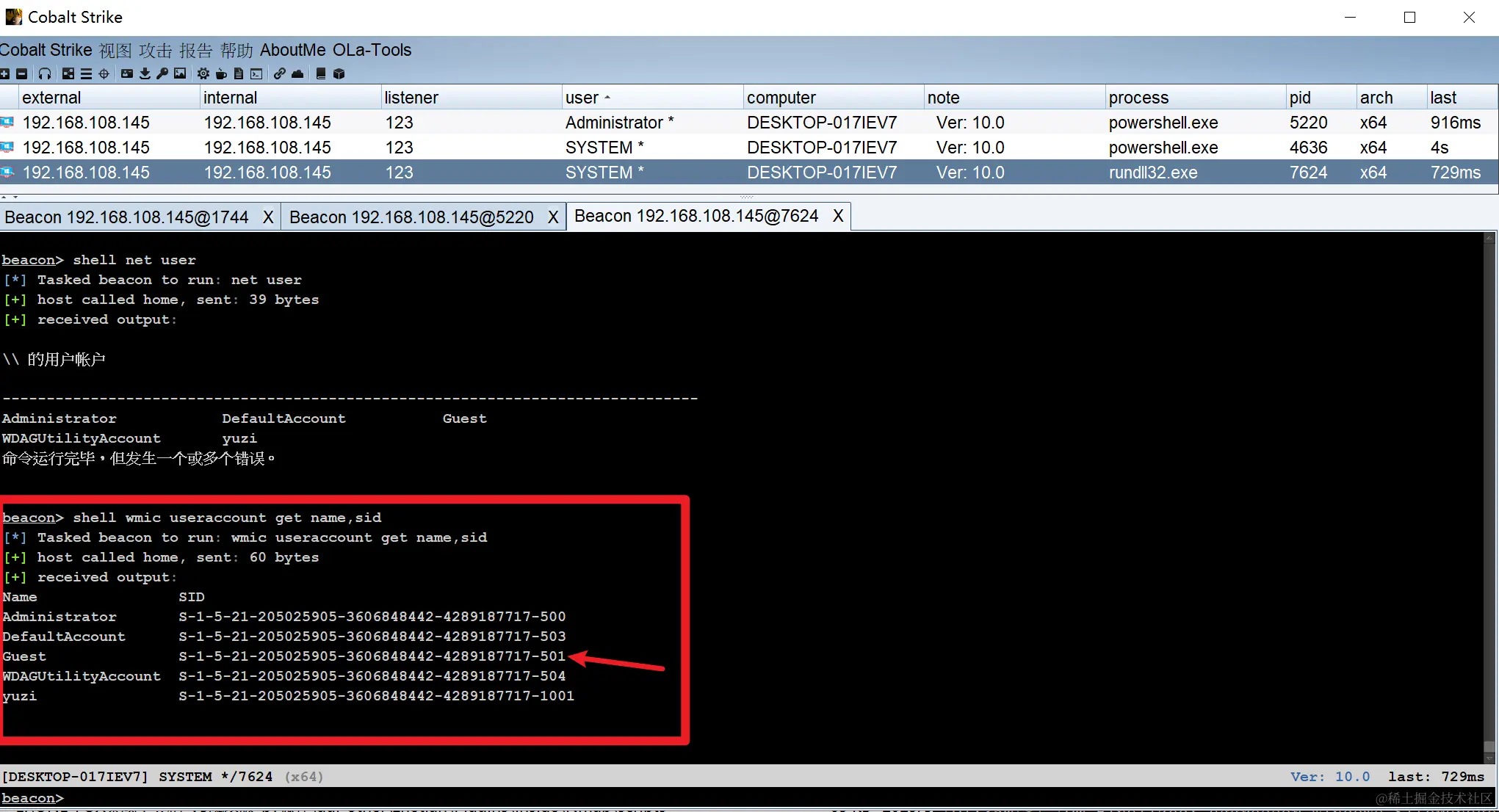 查询用户的SID,方便选择克隆对象(常克隆Guest用户,系统自带不易察觉且默认的SID为501)