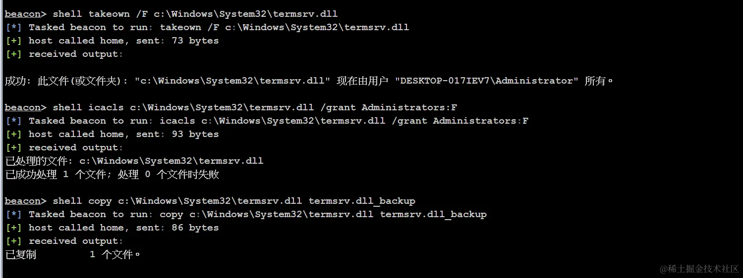 此时为了做到更加隐蔽的进行登录(强迫登录会使对方会话掉线),可以修改termsrv.dll文件实现,操作前要将所有权转移给本地管理员,向本地管理员组授予对termsrv.dll文件的“完全控制”权限(若是通过powershell无文件远控的形式执行如下命令可能会出现问题,则需要在可执行木马的远控场景执行命令)