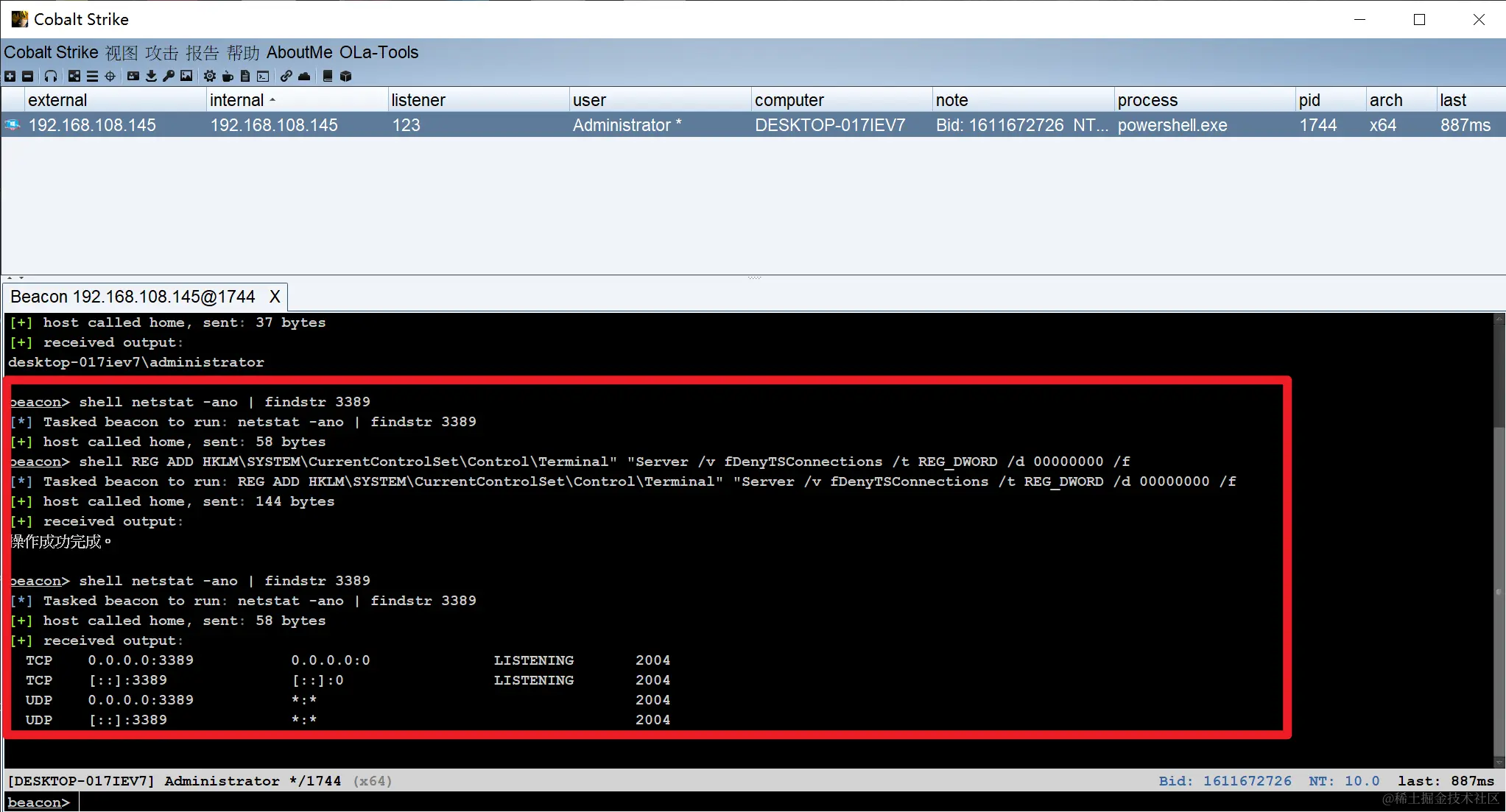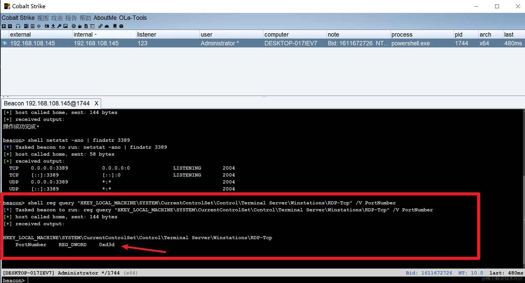 在获取权限后,针对3389进行展开,先查询3389端口是否开启