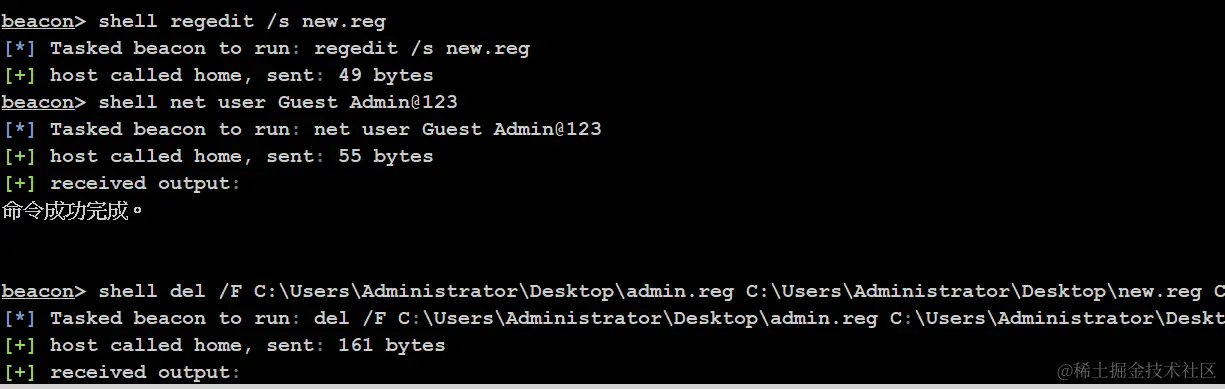 net user Guest Admin@123del /F C:\Users\Administrator\Desktop\admin.reg C:\Users\Administrator\Desktop\new.reg