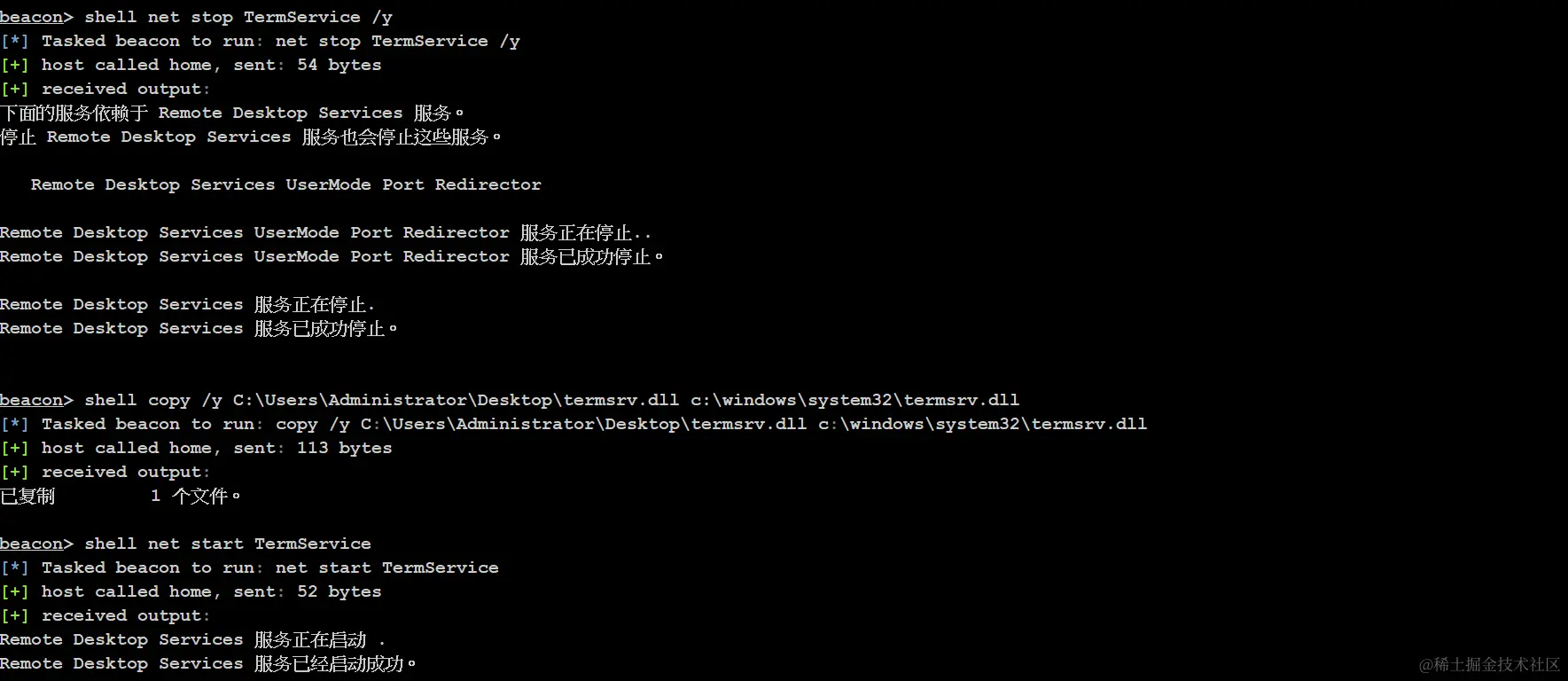net stop TermService /ycopy /y C:\Users\Administrator\Desktop\termsrv.dll c:\windows\system32\termsrv.dllnet start TermService