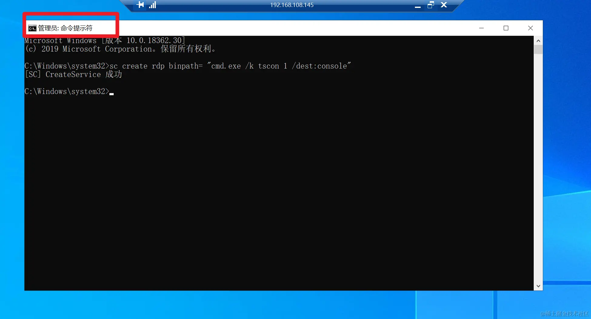 以管理员权限运行cmd,创建服务(用于会话劫持的权限需要system,恰好Windows的服务是以system权限运行,其中的1为需要劫持的ID值)