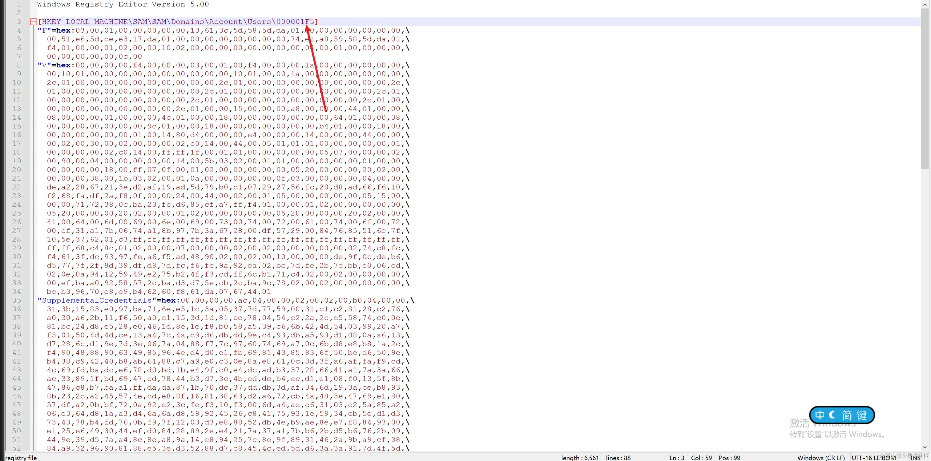 将admin.reg文件的第三行HKEY_LOCAL_MACHINE\SAM\SAM\Domains\Account\Users\000001F4中的“1F4”修改为Guest的SID为1F5(十六进制),并保存为new.reg(方便区分)