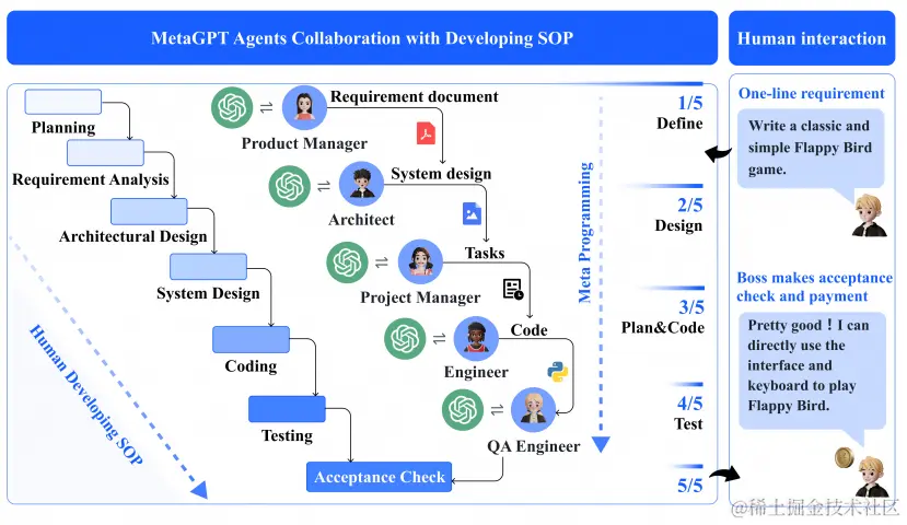 端到端开发:从产品需求到技术设计,再到具体编码,MetaGPT通过多智能体的协作可以完成整个软件开发生命周期。