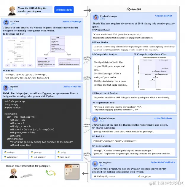 端到端开发(End-to-End Development):从产品需求到技术设计,再到具体编码,MetaGPT通过多智能体的协作可以完成整个软件开发生命周期。