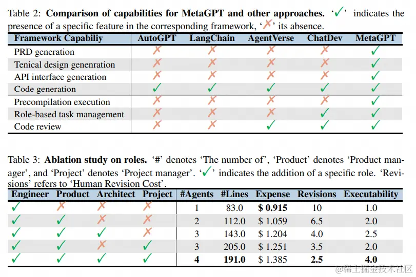 - 在实验评估中,MetaGPT实现了100%的任务完成率,进一步强调了MetaGPT框架的鲁棒性和效率。