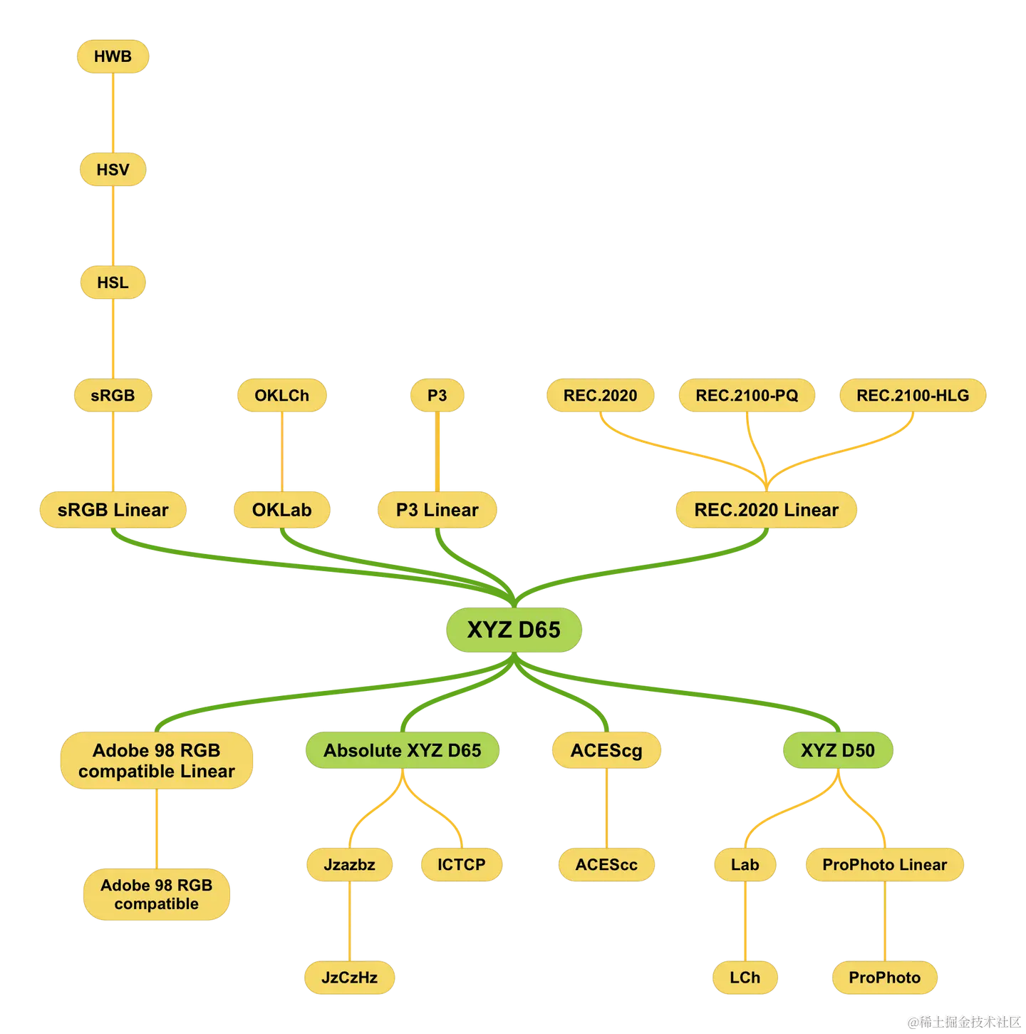 - 可以从任意色彩空间转换到目标色彩空间, 甚至是CSS自定义属性.