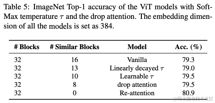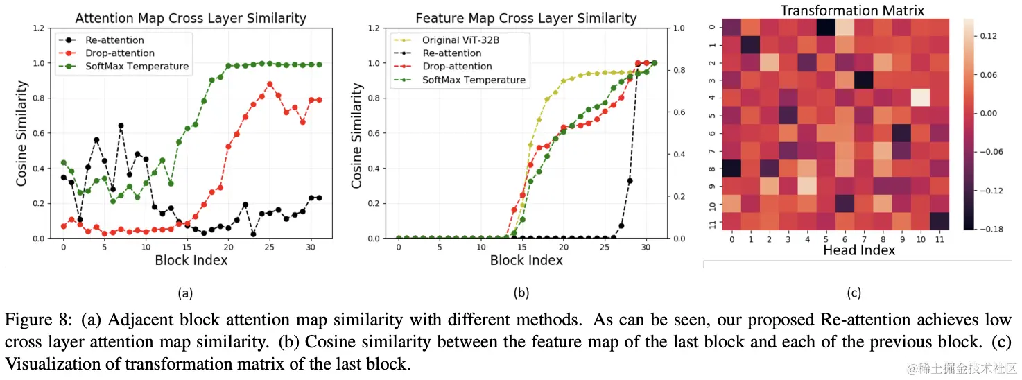 SoftMax温度),Re-attention利用Head之间的交互来收集互补信息,可以更好地提高注意力图的多样性。 - Re-attention高效且易于实现,与原始的自注意力相比,只需要几行代码和可忽略不计的计算开销,比增加嵌入维度的方法更高效。
