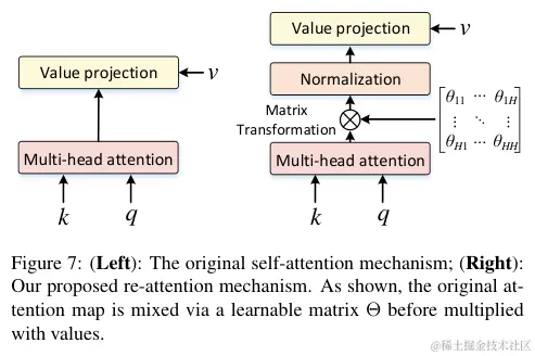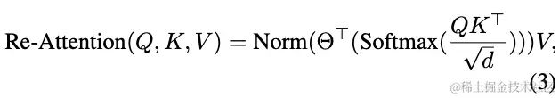 Re-attention使用Head的注意力图作为基础,通过动态聚合生成一组新的注意力图。为了实现这一点,首先定义一个可学习的变换矩阵,在乘以V之前,使用该矩阵混合多个Head的注意力图重新生成新的注意力图。具体来说,Re-attention可定义为以下公式: