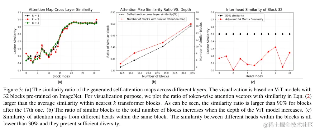 为了进一步验证不同深度的ViT是否存在这种现象,我们分别对12、16、24和32层的ViT进行了相同的实验,并计算了具有相似注意力图的块的数量。结果如图3b所示,当添加更多层时,相似注意力图的层数量与总层数的比率增加。