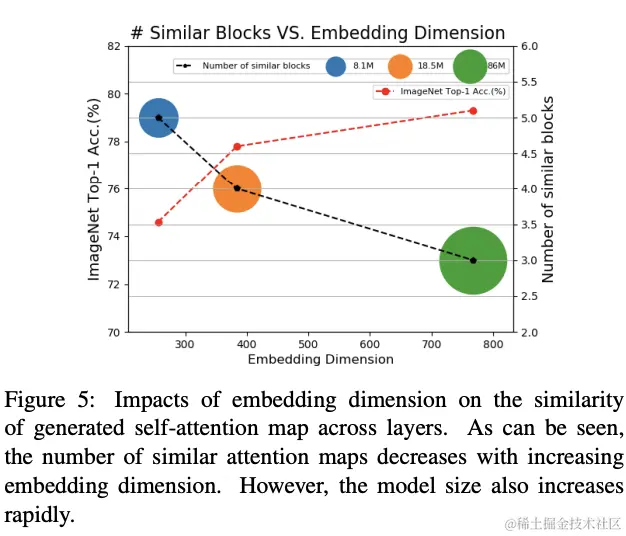 作者基于12层ViT进行了不同中间维度的快速实验,维度范围从256到768。如图5和表1所示,增加embedding维度能够减少具有相似注意力图的层数以及缓解注意力崩溃,模型性能也得到相应的提高。这验证了作者的核心假设,注意力崩溃是ViT扩展的主要瓶颈。尽管这个方法有效,但持续增加embedding维度会显著增加计算成本,而且带来的性能提升往往也会减弱。此外,更大的模型通常需要更多的数据进行训练,存在过拟合风险以及降低训练效率。