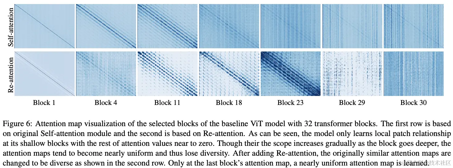 原始MHSA和Re-attention的注意力图可视化如图6所示。原始的MHSA学在较早层中主要关注相邻token之间的局部关系,并且随着层的深入逐渐覆盖更多token,最后在深层中具有高度相似性全局平均注意力图。在添加Re-attention后,深层的注意力图保持了多样性,并且与相邻层具有较小的相似性