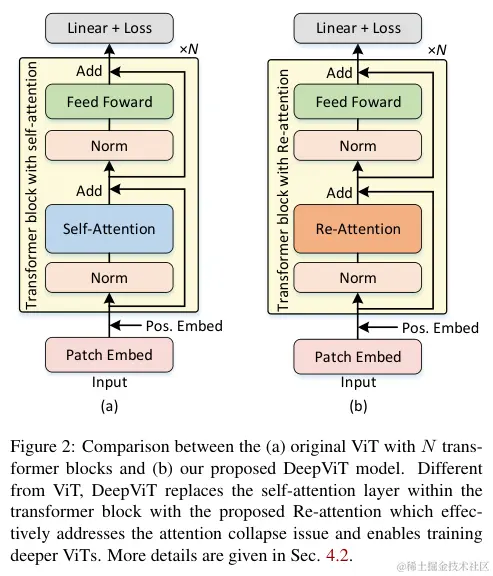 作者发现深层ViT出现的注意力崩溃问题,提出了新颖的Re-attention机制来解决,计算量和内存开销都很少,在增加ViT深度时能够保持性能不断提高