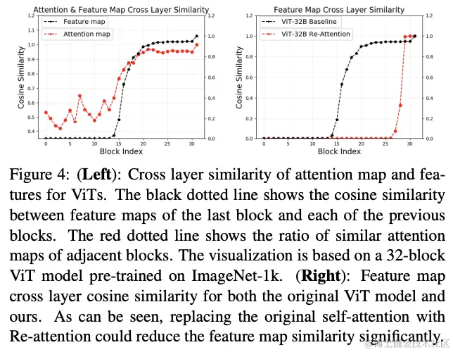 基于公式2,将ImageNet-1k上预训练32层ViT模型的所有注意力图之间的相似性进行可视化。如图3a所示,在第17层之后,相邻层的注意力图的相似度大于90%,这表明后面学习的注意力图都是相似的,即注意力崩溃问题。