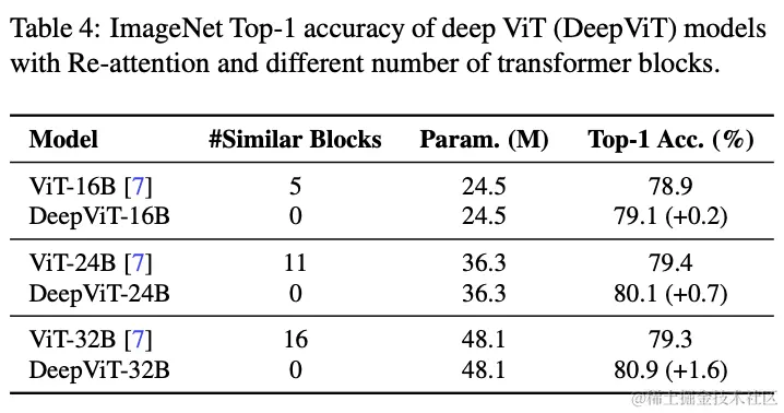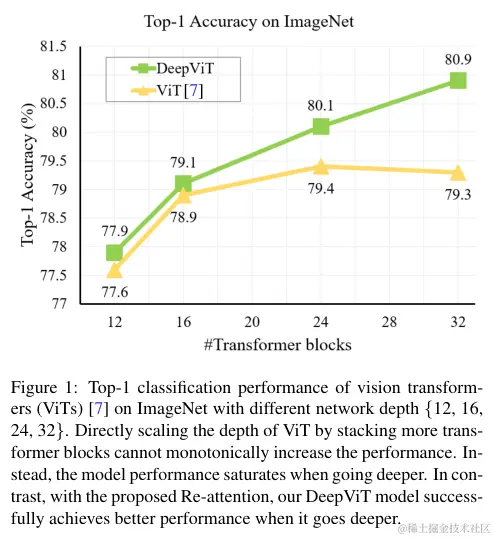 在没有任何额外的数据增强和正则化策略的情况下,只需用Re-attention替换ViTs中的MHSA模块,就可以训练非常深的ViT模型并得到相应的性能提升,如图2所示。