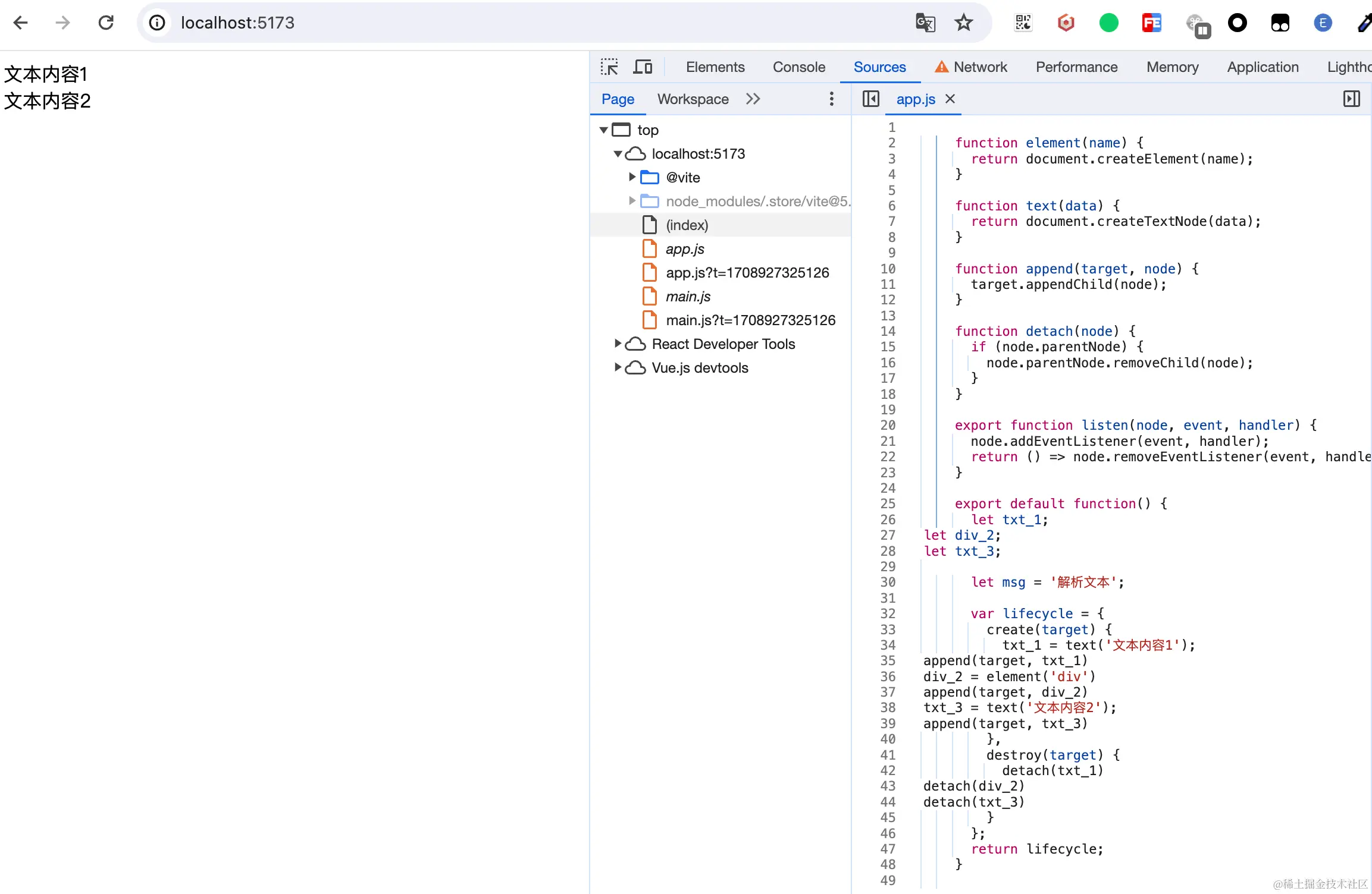 经过转换后,我们的create和destroy中已经存储了组件在创建时如何运行和销毁时如何运行的js代码。