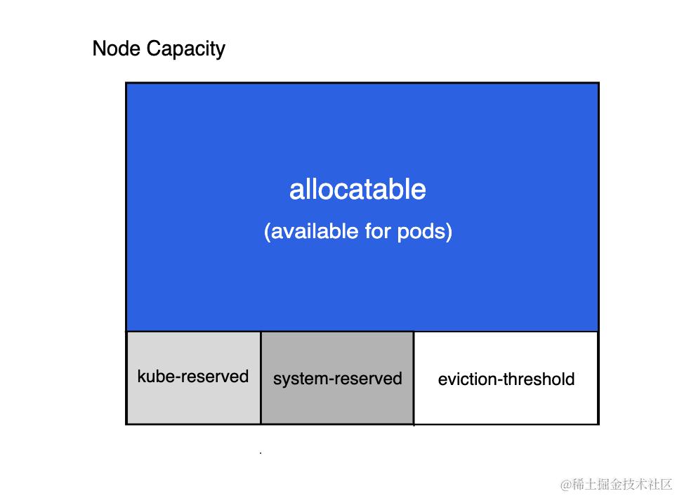 节点资源分为两部分,一部分是已经分配给节点上某些k8s组件的资源,这是不可改变也不可取消的;另一部分则是可分配的资源,在调度pod到节点上时比较的就是这部分资源,如果allocatable资源不足,即allocatable < pod request,那么就不会分配到该节点上;已经在该节点上运行的pod消耗的也是这部分资源。