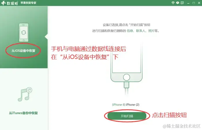 步骤2.在电脑打开下载好的软件,再使用数据线将手机连接到电脑上。通常,对于没有备份的情况,可以选择【从iOS设备中恢复】选项,再点击 【开始扫描】 按钮。