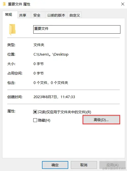 第一步:选择需要加密的电脑文件夹,然后鼠标右键它,选择 “属性” ,在 “常规” 下方,选择 “高级” 选项。
