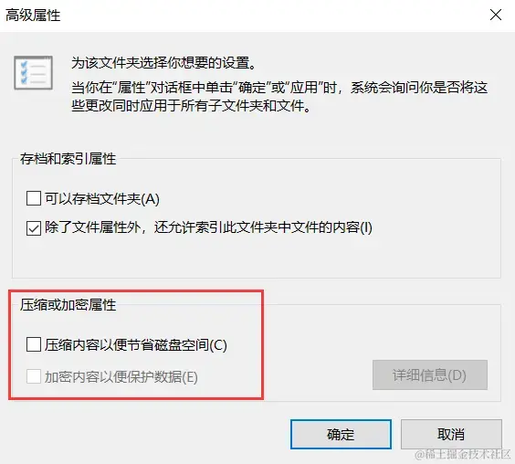 第二步:之后就会继续弹出一个页面,在压缩或加密属性下,选择 “加密内容以便保护数据” ,然后确定选择。