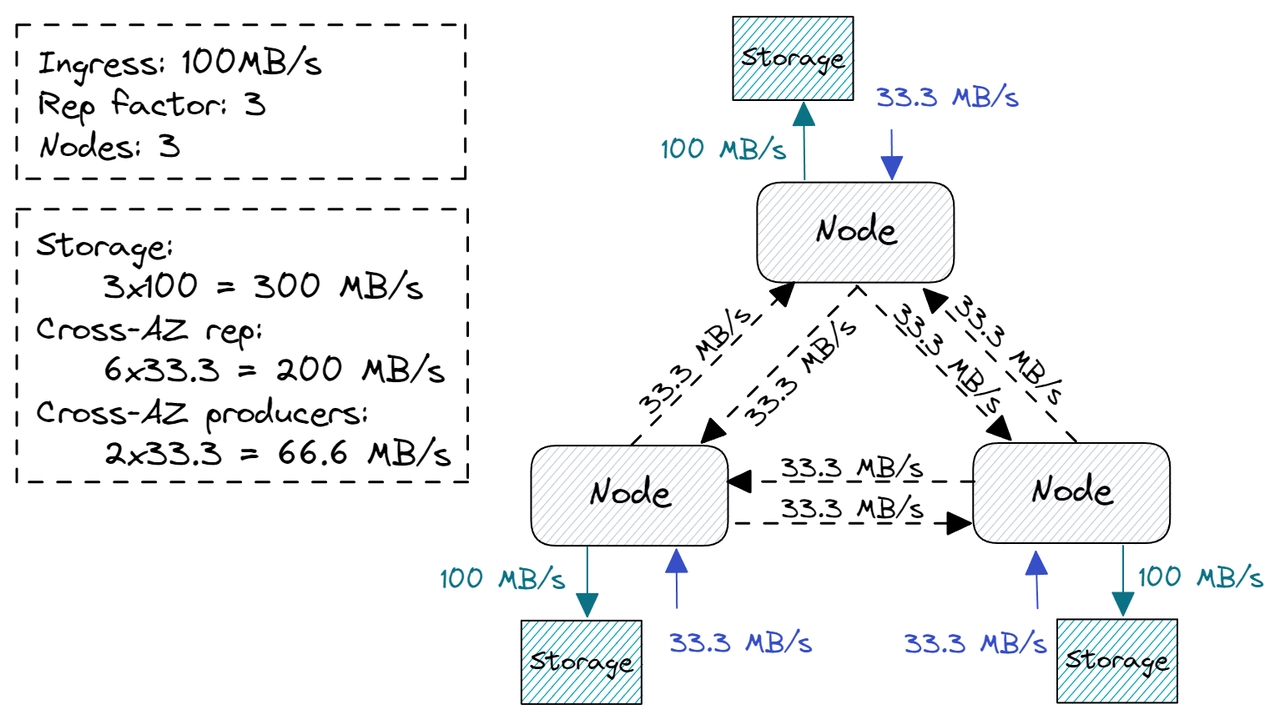 例如,假设有 3 个节点、复制因子为 3 且聚合入口为 100 MB/s,我们得到: