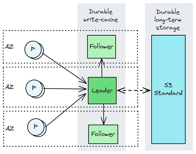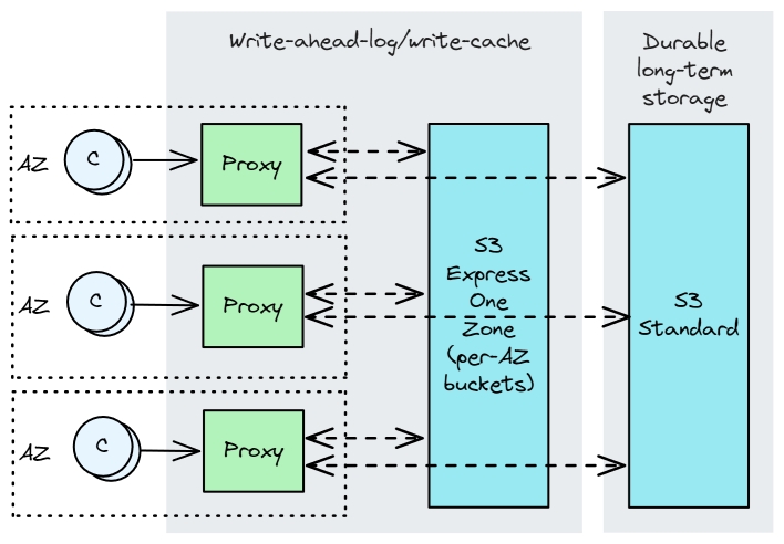 图 3. 客户端与区域本地代理交互,而后者又同步写入 S3 Express One Zone。不会发生跨可用区的数据传输,从而避免了这一巨大的云成本来源。数据被压缩为更大的对象,并异步卸载到 S3 Standard 中的长期存储中