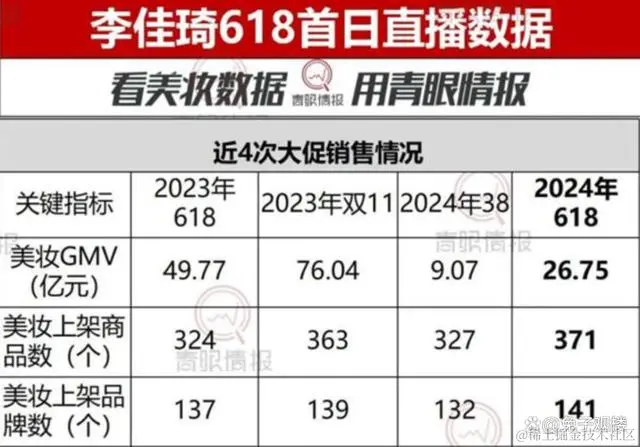 今年618,据“青眼情报”数据,李佳琦618预售第一日,直播间的美妆类目GMV(商品成交总额)超26.75亿元,同比下降46%。