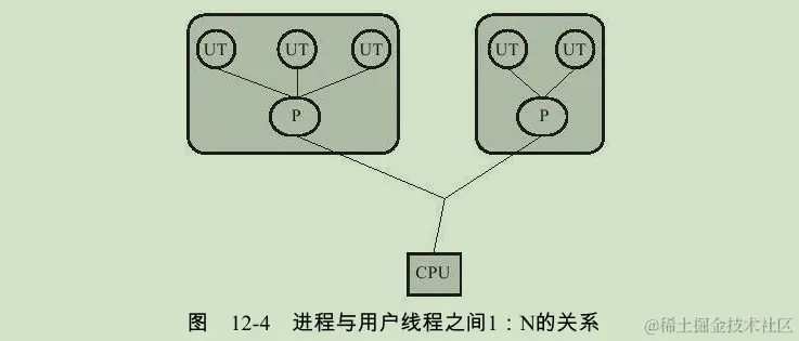 而狭义上的用户线程指的是完全建立在用户空间的线程库上,系统内核不能感知线程存在的实现。用户线程的建立、同步、销毁和调度完全在用户态中完成,不需要内核的帮助。如果程序实现得当,这种线程不需要切换到内核态,因此操作可以是非常快速且低消耗的,也可以支持规模更大的线程数量,部分高性能数据库中的多线程就是由用户线程实现的。这种进程与用户线程之间1:N的关系称为一对多的线程模型,如图所示。