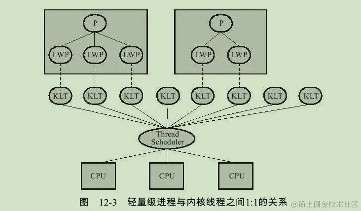 程序一般不会直接去使用内核线程,而是去使用内核线程的一种高级接口——轻量级进程(Light Weight Process,LWP),轻量级进程就是我们通常意义上所讲的线程,由于每个轻量级进程都由一个内核线程支持,因此只有先支持内核线程,才能有轻量级进程。这种轻量级进程与内核线程之间1:1的关系称为一对一的线程模型,如图所示。