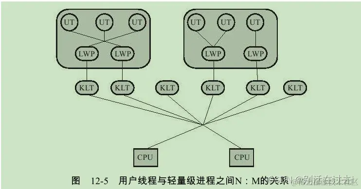 线程除了依赖内核线程实现和完全由用户程序自己实现之外,还有一种将内核线程与用户线程一起使用的实现方式。在这种混合实现下,既存在用户线程,也存在轻量级进程。用户线程还是完全建立在用户空间中,因此用户线程的创建、切换、析构等操作依然廉价,并且可以支持大规模的用户线程并发。而操作系统提供支持的轻量级进程则作为用户线程和内核线程之间的桥梁,这样可以使用内核提供的线程调度功能及处理器映射,并且用户线程的系统调用要通过轻量级线程来完成,大大降低了整个进程被完全阻塞的风险。在这种混合模式中,用户线程与轻量级进程的数量比是不定的,即为N:M的关系,如图12-5所示,这种就是多对多的线程模型。