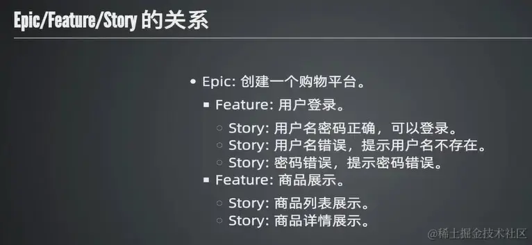 - epic 与 feature、feature 与 story 类似于父子关系。