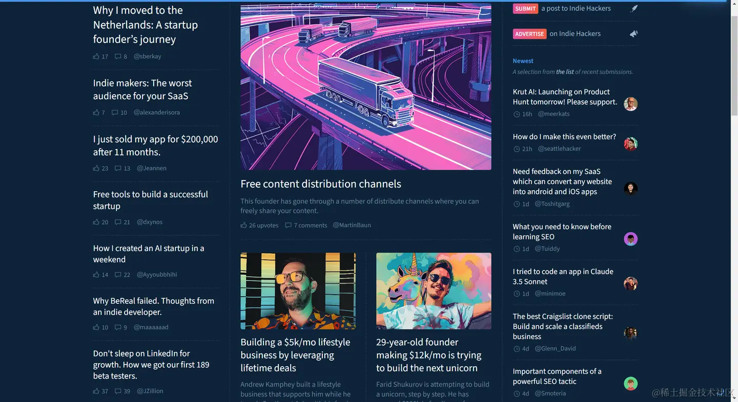Indie Hackers是一个专门用于初创企业和独立开发者发布新产品的平台,它和producthunt的主要区别大概就是纯暗黑风格吧。